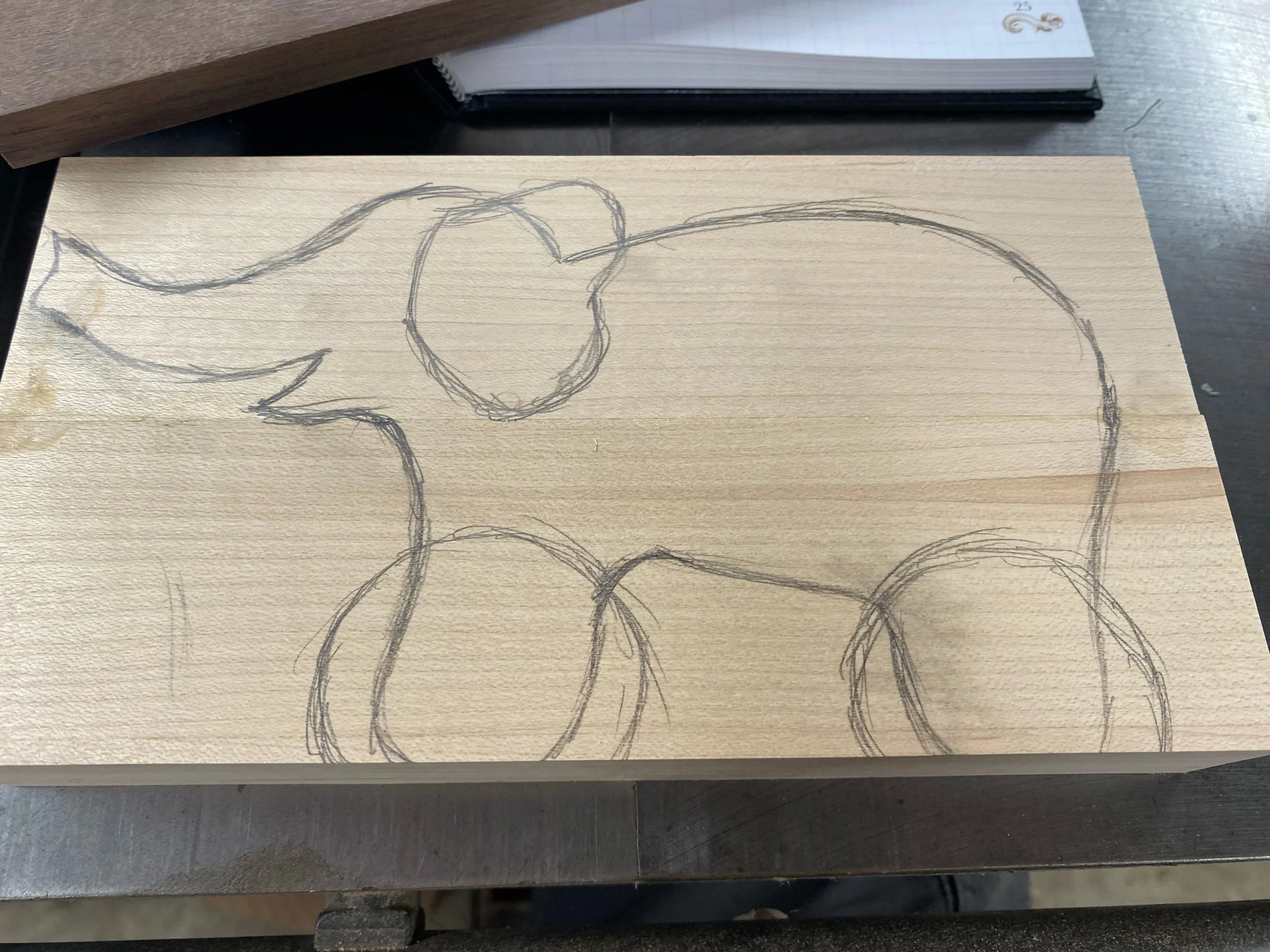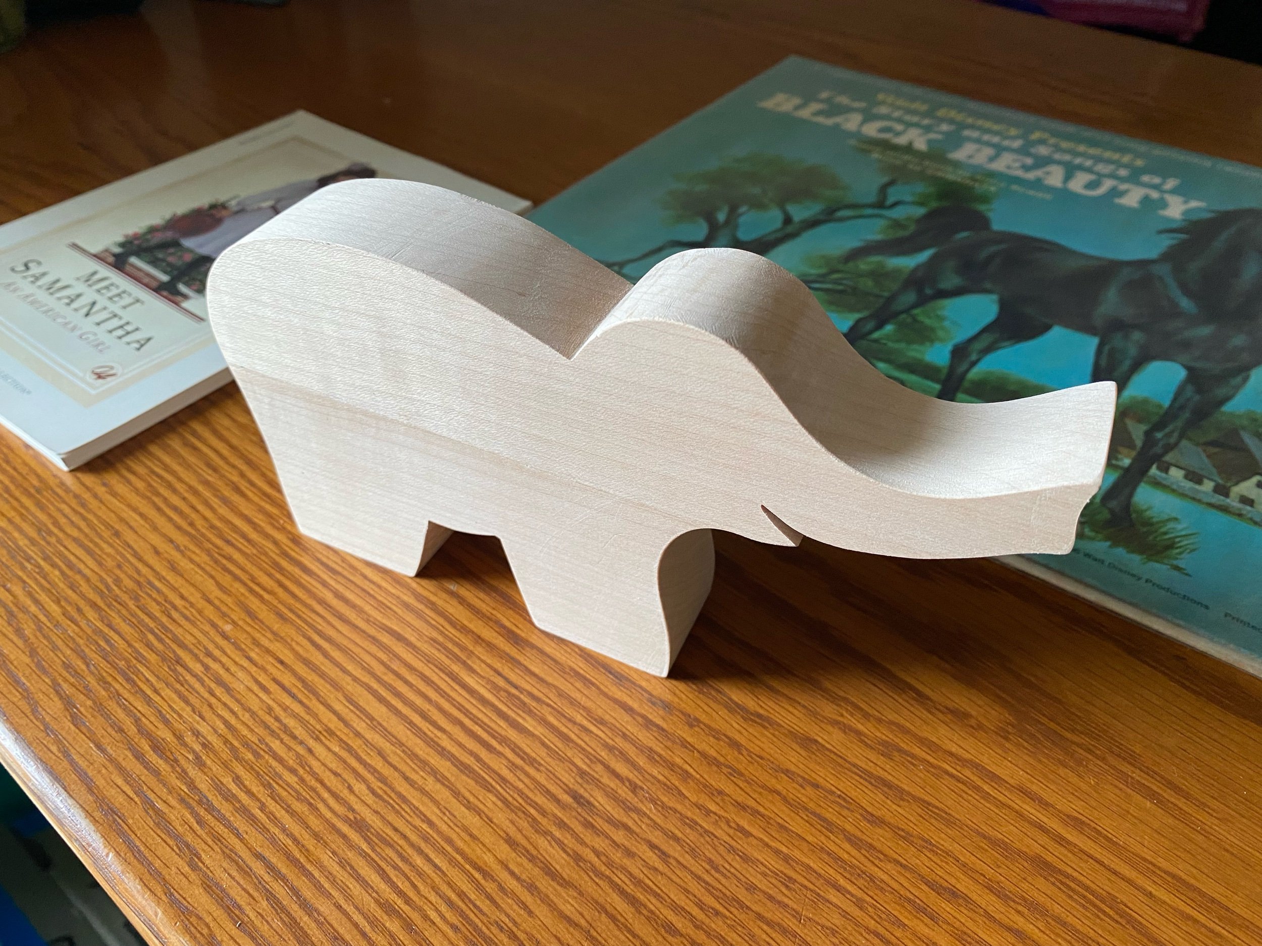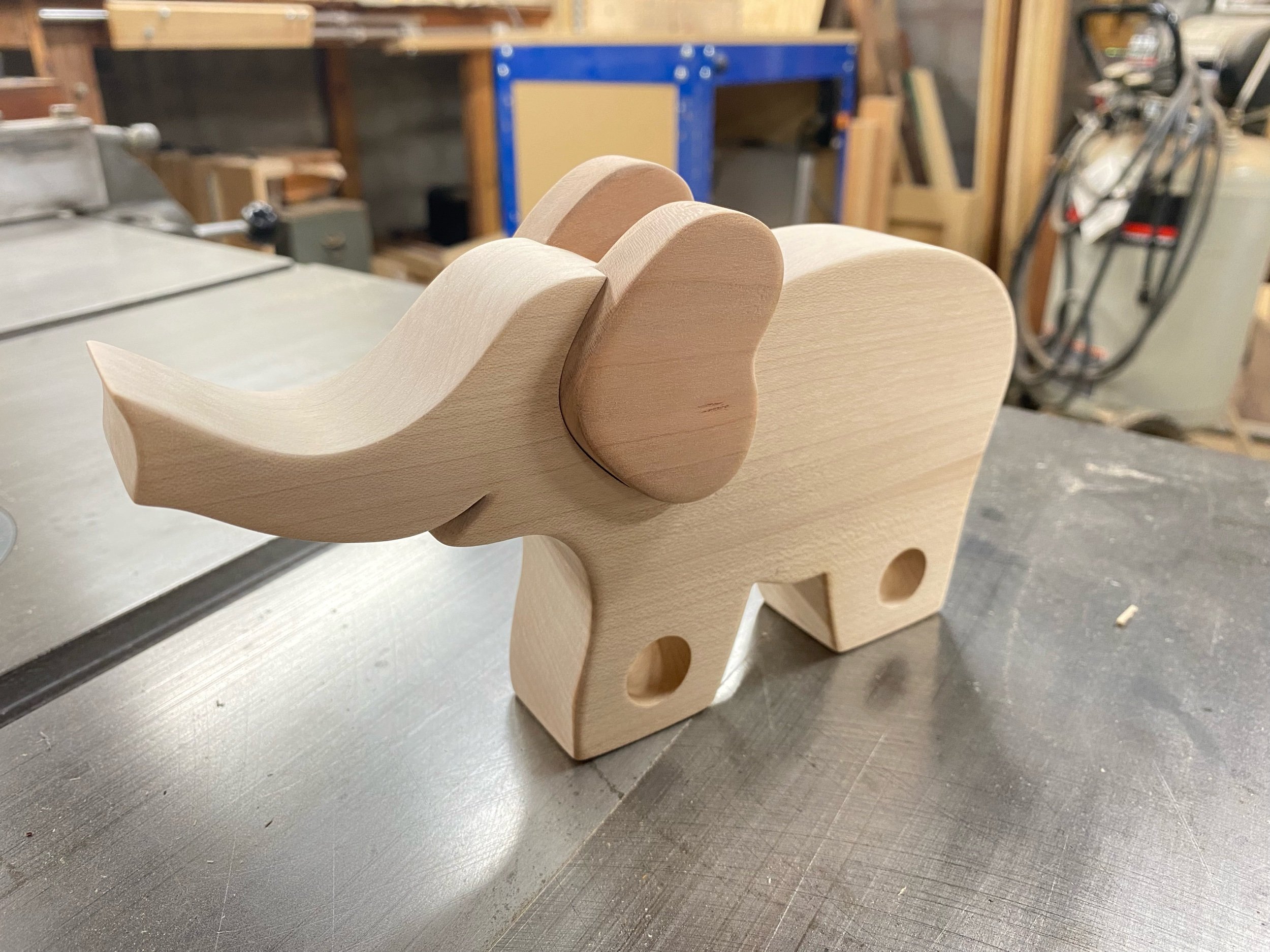 This elephant is primarily made from hard maple, with ears and wheels of cherry.